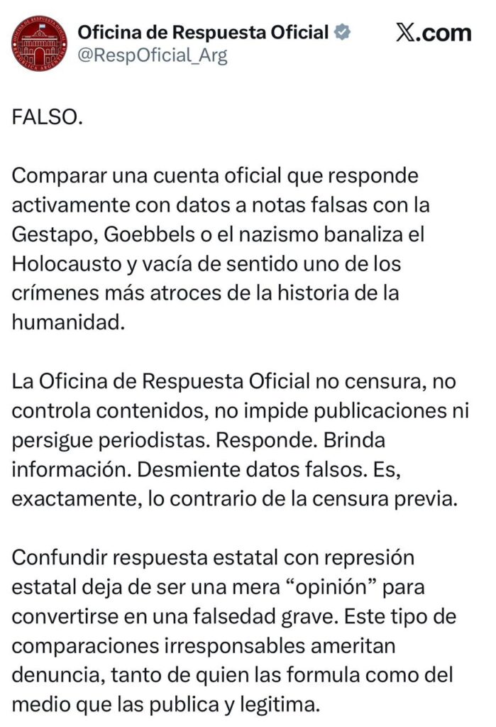 El pronunciamiento fue firmado por el presidente de la DAIA, Mauro Berenstein, y se suma a una declaración previa de la Oficina de Respuesta Oficial, que también cuestionó el uso de referencias al nazismo para describir acciones de un gobierno democrático. Desde ese organismo advirtieron que equiparar una cuenta oficial que responde con datos a informaciones falsas con la Gestapo, Joseph Goebbels o el nazismo “vacía de sentido uno de los crímenes más atroces de la historia de la humanidad”.