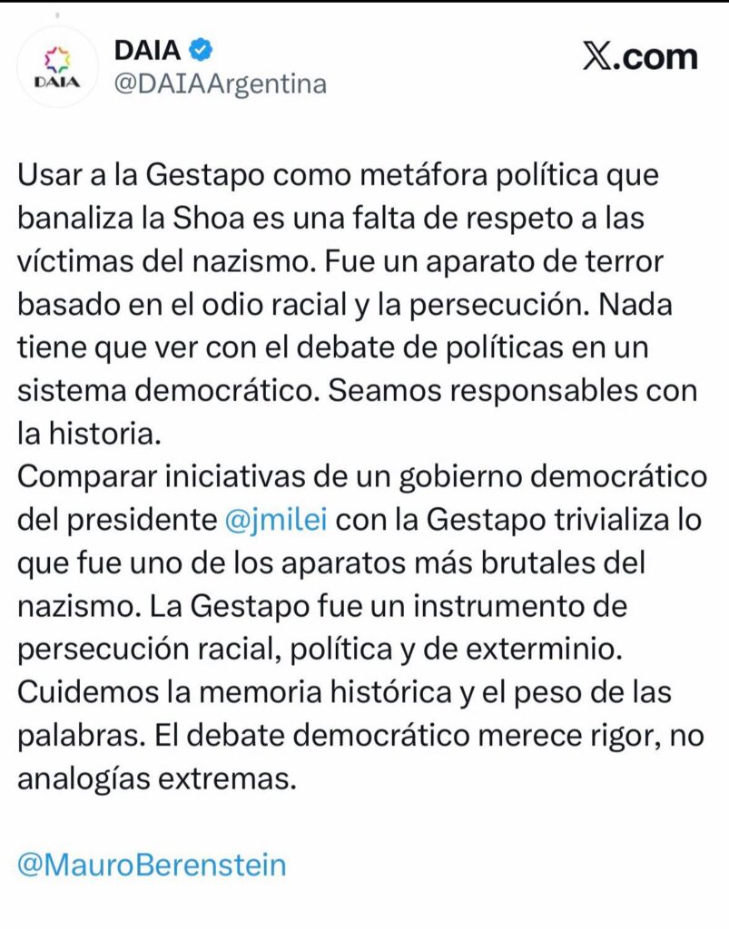 Asimismo, la organización señaló que equiparar iniciativas de un gobierno democrático, como el encabezado por el presidente Javier Milei, con la Gestapo implica trivializar uno de los instrumentos más brutales del nazismo, responsable de la persecución racial, política y del exterminio de millones de personas.