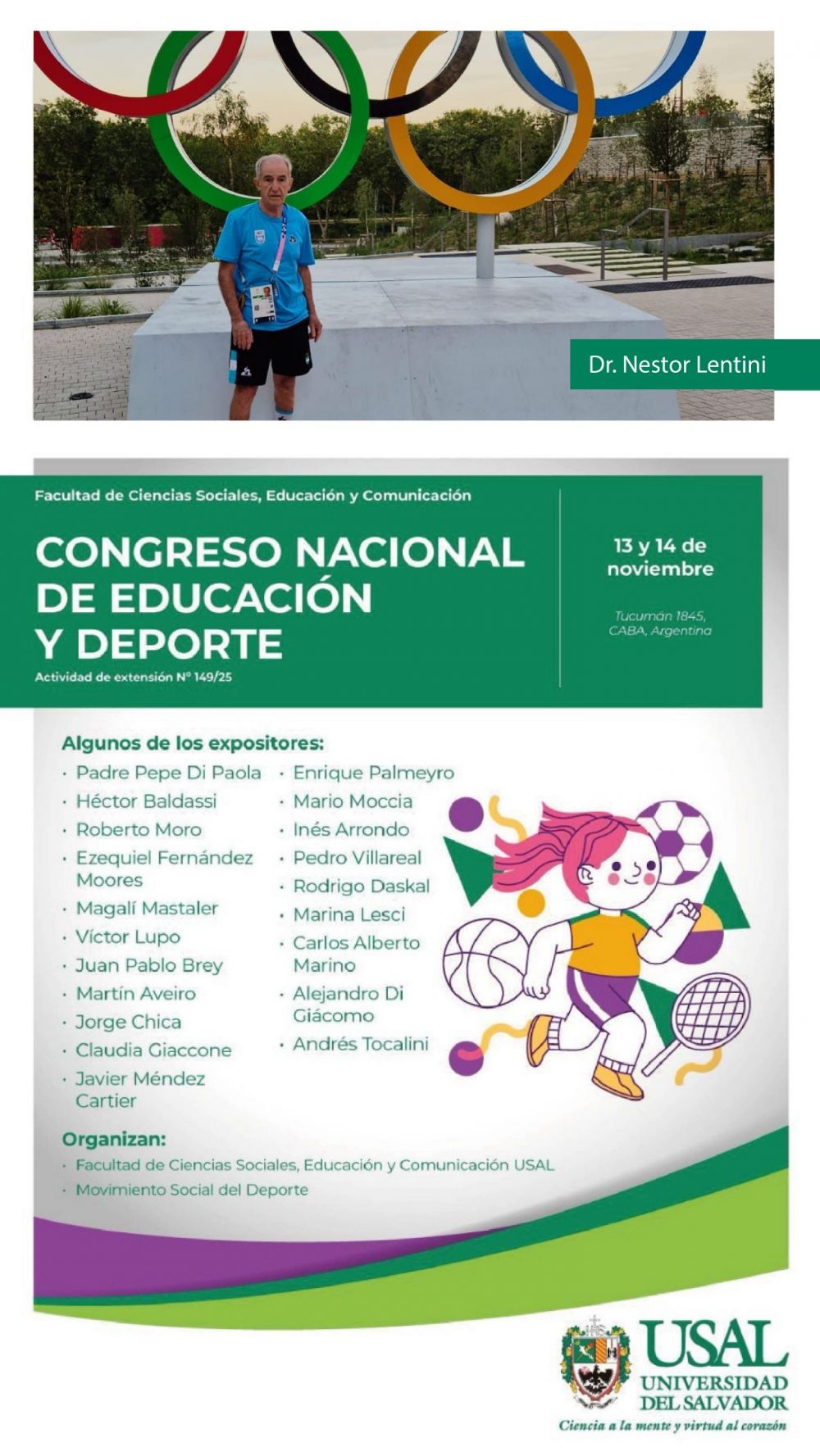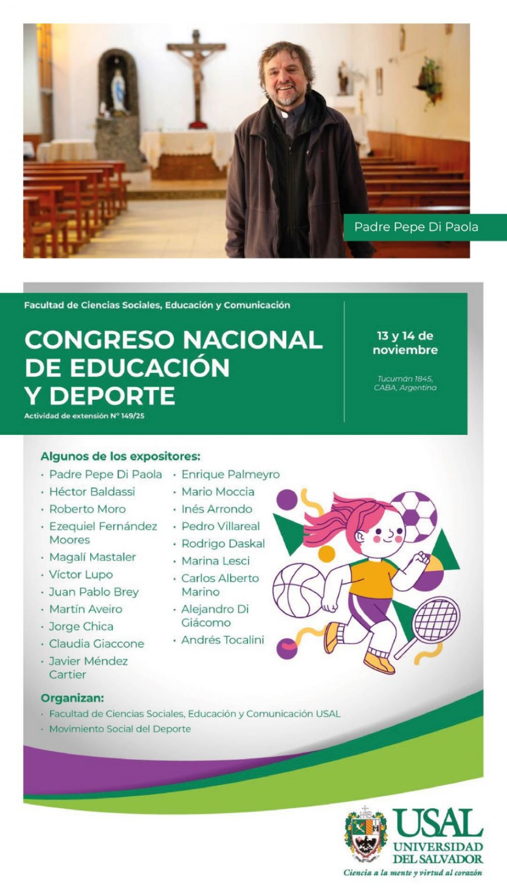 La Facultad de Ciencias Sociales, Educación y Comunicación de la Universidad del Salvador (USAL), el Movimiento Social del Deporte (MSD) y la Organización de Estados Iberoamericanos (OEI) convocan al Congreso Nacional de Educación y Deporte, un espacio de diálogo que busca fortalecer lazos entre estos dos mundos como herramientas clave para la construcción de comunidad y la paz social.