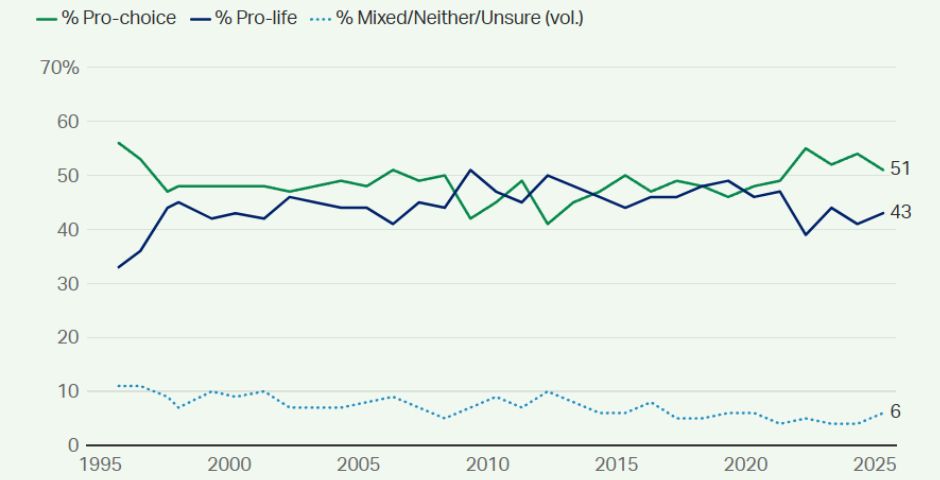 Según el informe anual de la encuestadora Gallup sobre el aborto, el 43% de los encuestados se identifica ahora como provida, un aumento de dos puntos porcentuales con respecto al año anterior.