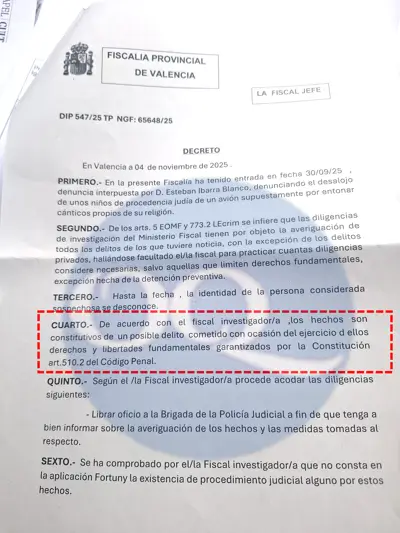 Según ese documento, los hechos denunciados —el desalojo de "unos niños de procedencia judía" de un avión, supuestamente por entonar cánticos religiosos— podrían constituir un delito contra las libertades garantizadas por la Constitución, conforme al artículo 510.2 del Código Penal.