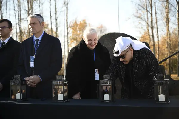 El influencer árabe Amjad Taha enciende una vela en el campo de Auschwitz-Birkenau durante una ceremonia de recuerdo por las víctimas del Holocausto (Foto: EJA)