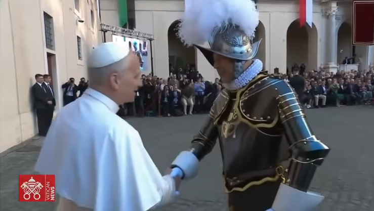 León XIV participa en la "hermosa" ceremonia de juramento en el Patio de San Dámaso del Palacio Apostólico. Al dar las gracias a los reclutas, subrayó el valor de su testimonio en el mundo de hoy, de un modo de vivir la fe "que habla verdaderamente a todos los jóvenes del valor de dar la vida, de servir y de pensar en los demás".