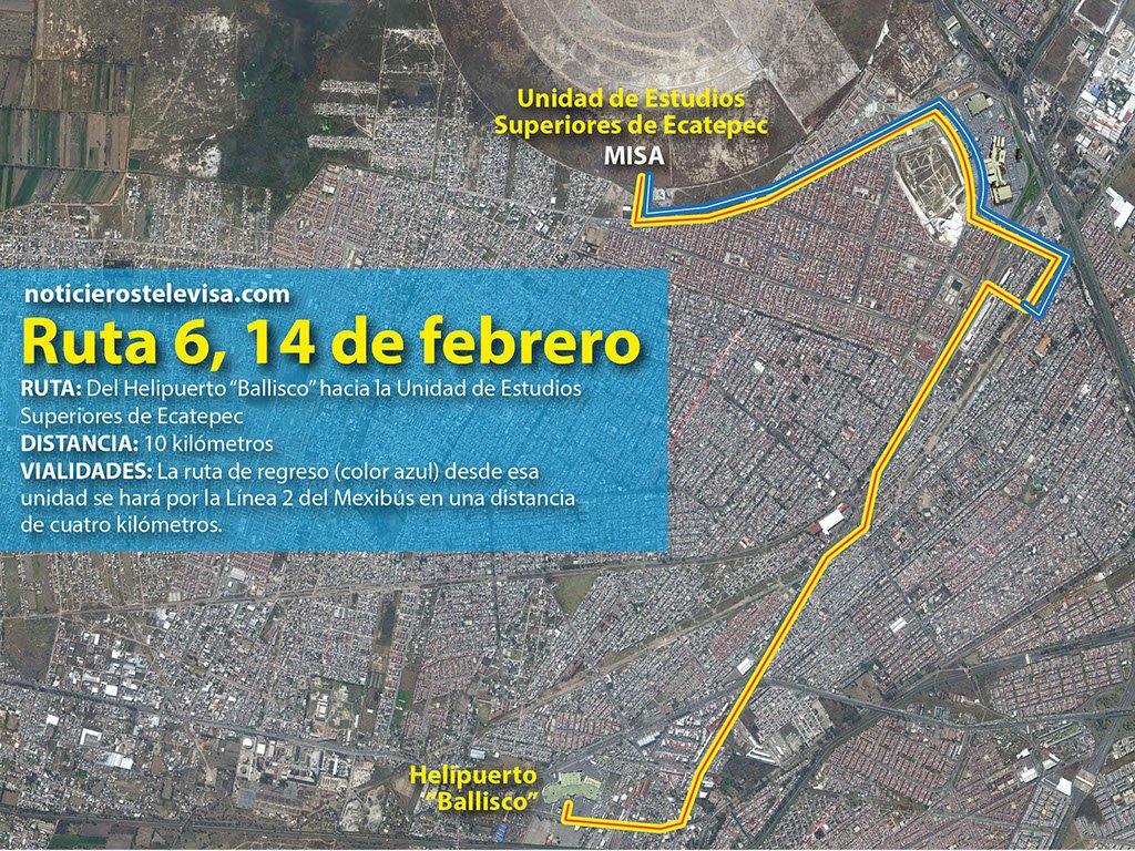 El helicóptero que lo conducirá a Ecatepec aterrizará en el edificio del Tianguis de Autos Ballisco. El Pontífice recorrerá las avenidas Lechería Texcoco, Central e Insurgentes hasta llegar al Centro de Estudios de Ecatepec, conocido como “El Caracol”, donde presidirá una Misa.