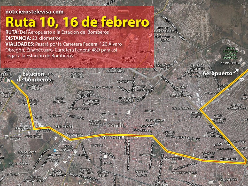 En Morelia irá del Aeropuerto hasta la Estación de Bomberos por la Carretera Federal 120 Álvaro Obregón, Zinapécuaro y la Carretera Federal 48D.