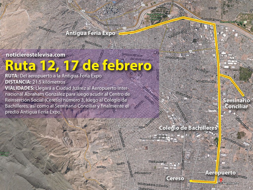 El recorrido hasta la zona conocida como “la Villa” durará 35 minutos. La ruta del papamóvil será por Insurgentes, el Eje 8 Sur, el Eje Central Lázaro Cárdenas, Paseo de la Reforma y la Calzada de Guadalupe hasta el Tepeyac. La Misa terminará a las 7:30 p.m. y el Papa Francisco volverá a la Nunciatura por esa misma ruta.