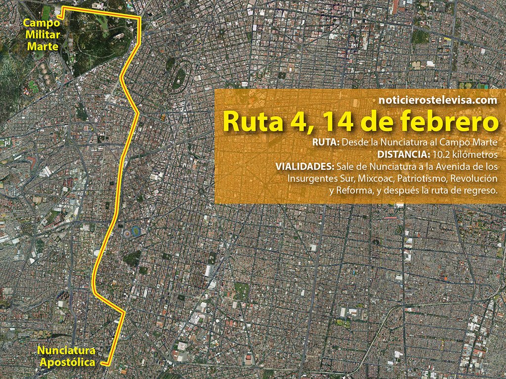 Al día siguiente, el Santo Padre saldrá de la Nunciatura a las 9:45 a.m. rumbo al helipuerto del Campo Militar “Marte”. Para llegar a ese lugar, se desplazará por las avenidas Insurgentes, Mixcoac, Patriotismo, Av. Revolución y Reforma.