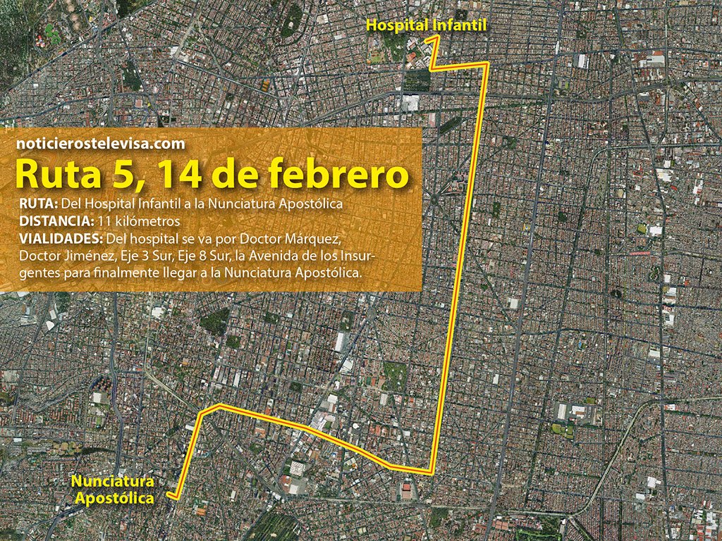 El recorrido para dirigirse a la Nunciatura durará 15 minutos y atravesará las vías Doctor Márquez, Doctor Jiménez, Eje 3 Sur, Eje 8 Sur e Insurgentes Sur.